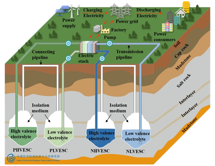 可再生能源的间歇性和波动性对大规模集成后的电网可靠性提出了重大挑战。因此,开发高效、经济、可靠的储能技术成为解决可再生能源大规模应用瓶颈的关键。地下液流电池是指利用地下盐穴或人工硐室作为地面液流电池正负极电解液的大型储存空间,并通过电堆实现能量储存与释放的一种新型储能技术。以盐穴作为电解液的储存场所,则必须考虑到我国盐岩的基本赋存特点是盐岩层数多、单层厚度薄和含不溶或难溶夹层多,属于典型的薄互层盐岩构造。因此,在我国建设盐穴液流电池不可避免地会遇到多夹层与沉渣对液流电池电化学性能的影响,以及电解液长时侵蚀对围岩力学及孔渗特性的影响,即盐穴赋存特征与液流电池电解液相互作用机制。而目前尚未有研究对该机制进行报道,因此,亟需对该机制开展深入研究,抢占科技制高点,为我国盐穴液流电池储能技术的创新与发展提供理论基础与技术支撑。