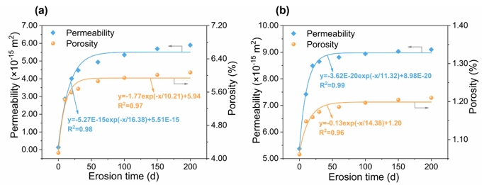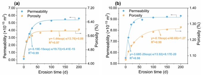 图3 阳极电解液MV侵蚀处理:(a)夹层样品的孔隙度和渗透率与侵蚀时长的关系;(b)盐岩样品的孔隙度和渗透率与侵蚀时长的关系。