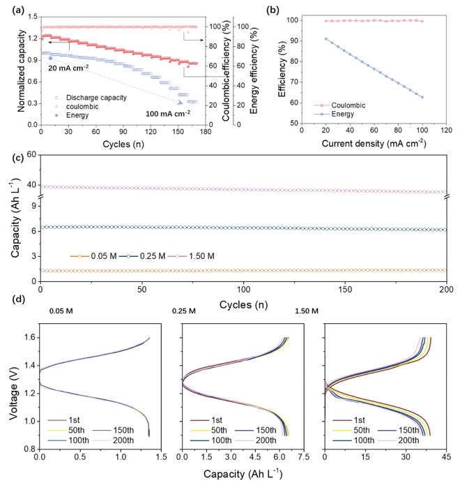 图4 以盐矿原位饱和卤水作为支持电解质的TMA-TEMPO/MV的速率性能和稳定性:(a)不同电流密度下的放电容量;(b)不同电流密度下的库仑效率和能量效率;(c)电解质浓度分别为0.05、0.25和1.5 M,在40 mA·cm-2下循环200次放电容量;(d)第1、50、100、150和200次循环对应的充放电曲线。