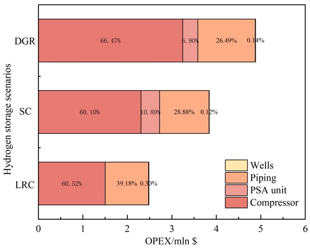图2 存储107kg H2各储氢场景下资本支出成本(CAPEX)组成,其中DGR(depleted gas reservoir)为枯竭气藏;SC(salt cavern)为盐穴;LRC(Lined rock cavern)为衬砌硐室